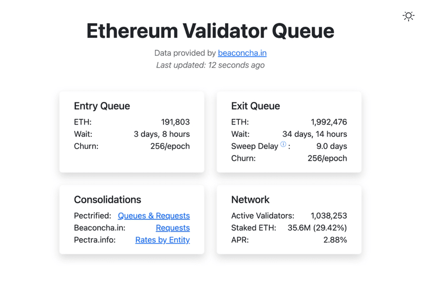 Dane z łańcucha bloków pokazują, że obecnie średni czas oczekiwania na wejście do systemu stakingu Ethereum wynosi około trzy dni, a czas oczekiwania na wyjście to około 34 dni, przy czym ponad 2 miliony tokenów czekają na wypłatę.