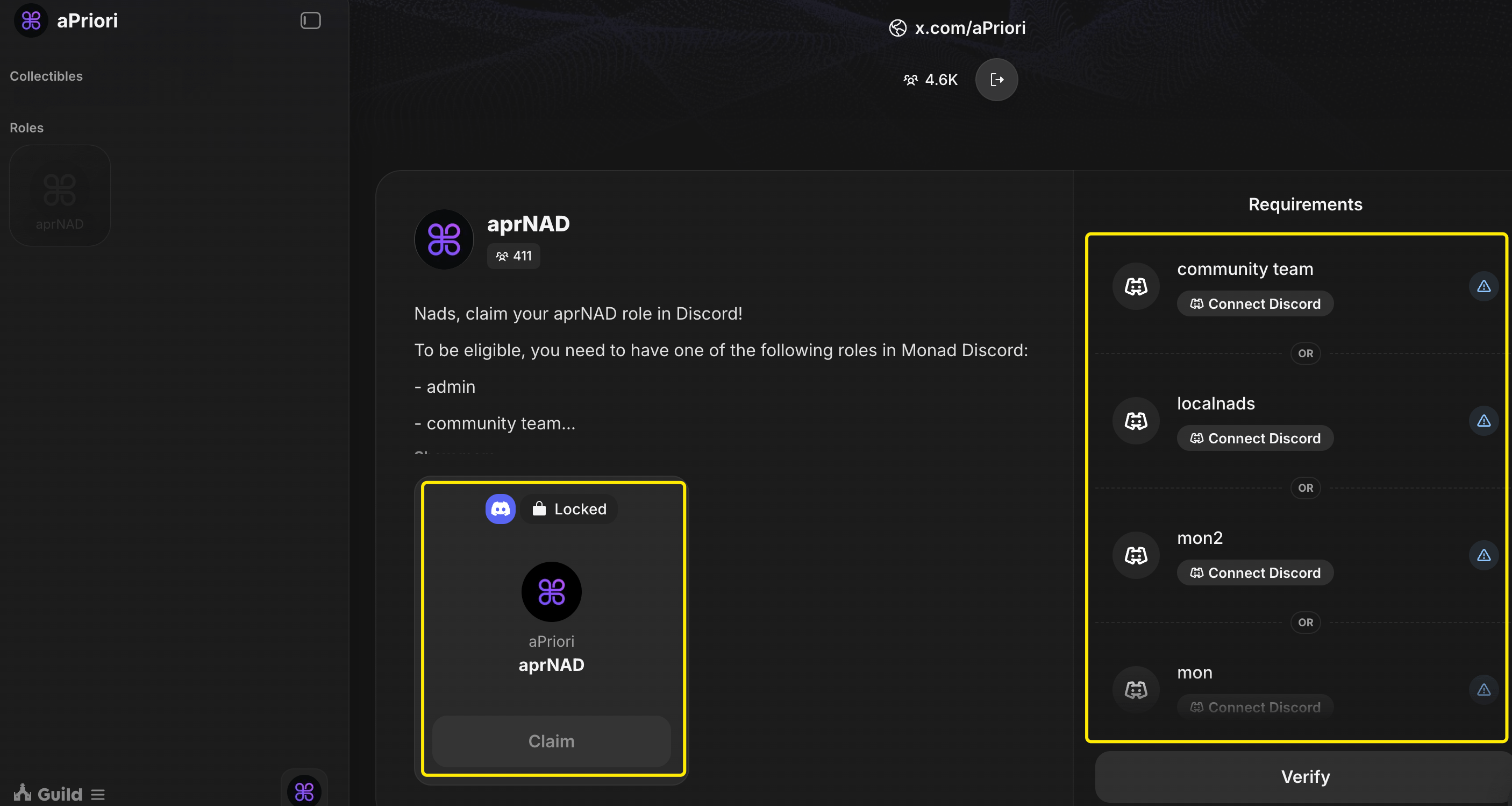 Najpierw, jeśli masz poniższe role na serwerze Discord Monad, możesz uzyskać aprNAD. 👉 Role kwalifikujące: administrator, zespół społeczności, mon2, mon, nad-OG, running hot, nads, localnads