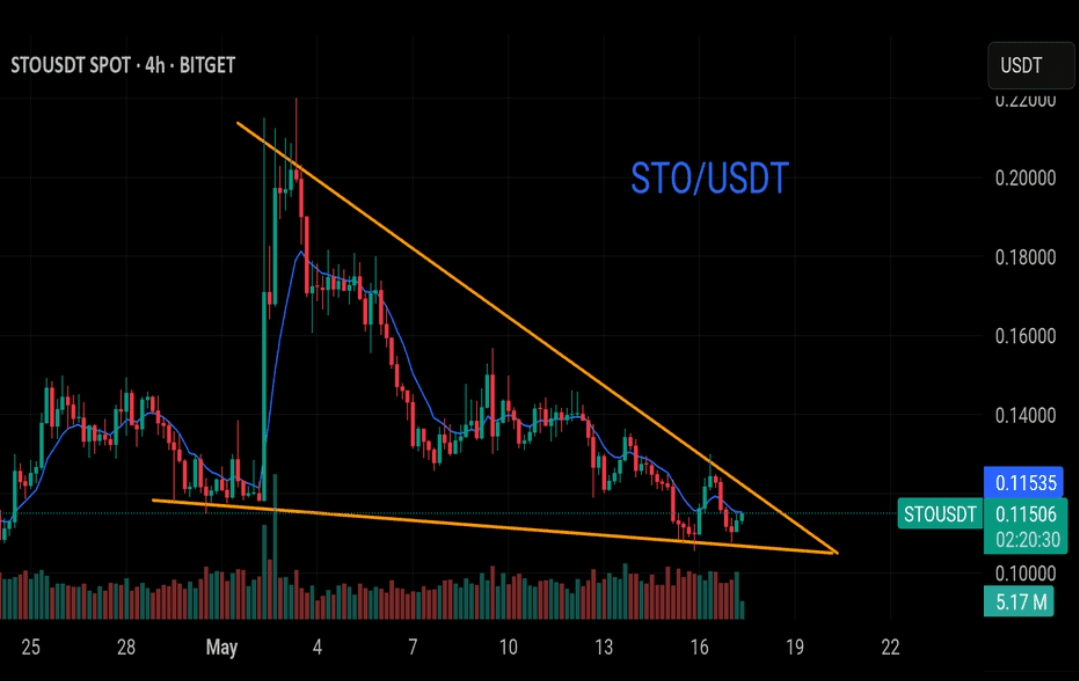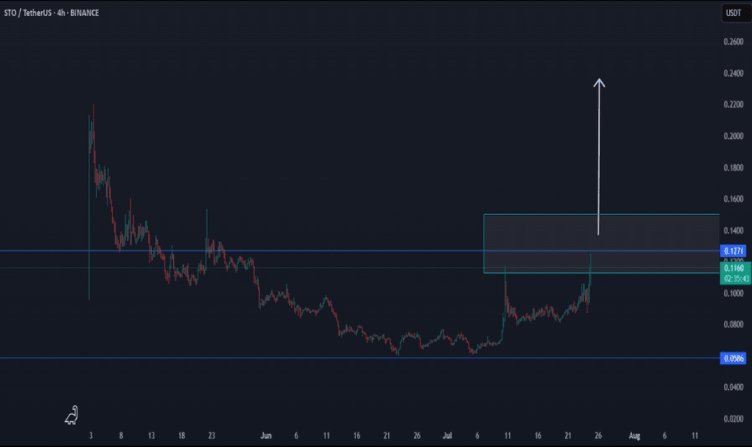 $STO konsoliduje się w pobliżu swojego wsparcia krótkoterminowego na poziomie $0.118, tworząc silną bazę akumulacyjną. Przełamanie powyżej $0.1300 może sygnalizować początek nowego wzrostu, celując w wyższe poziomy oporu.