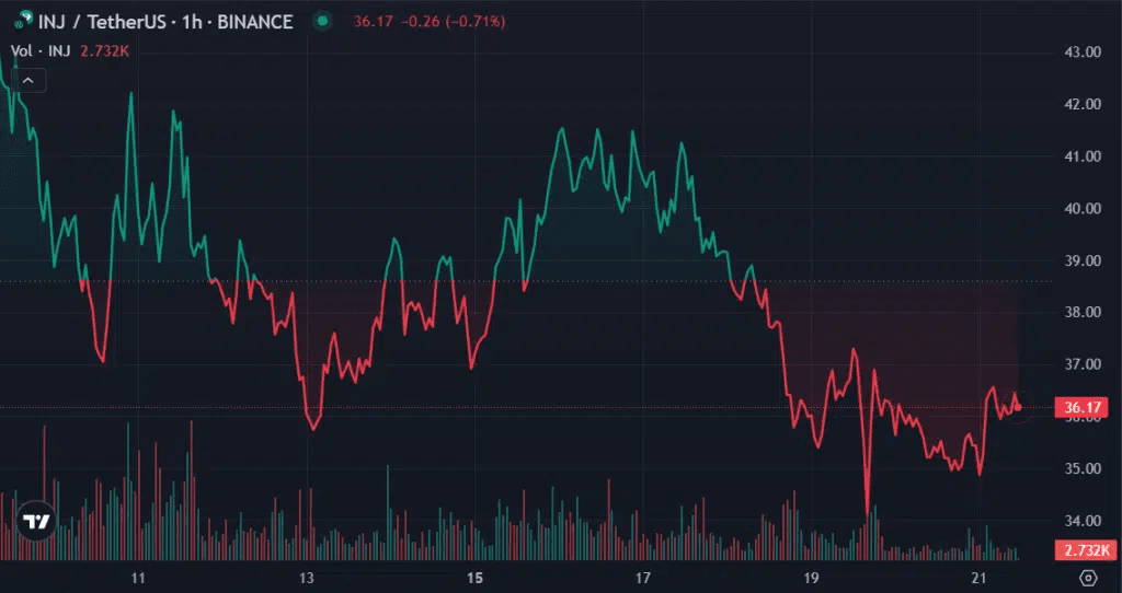Ciągły spadek spowodował, że wartość aktywów spadła poniżej 37 dolarów. Injective pragnie obecnie odrobić część strat, ponieważ dziś zmienił właściciela po cenie 36,2 USD, co oznacza wzrost o 2,25%.