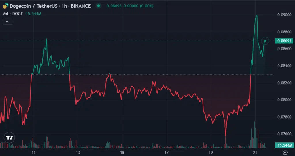 Pomimo uderzenia w przeszkodę na poziomie 0,09 USD, DOGE wykazał się odpornością i zakończył dzień ogromnym wzrostem na poziomie 11,71%.