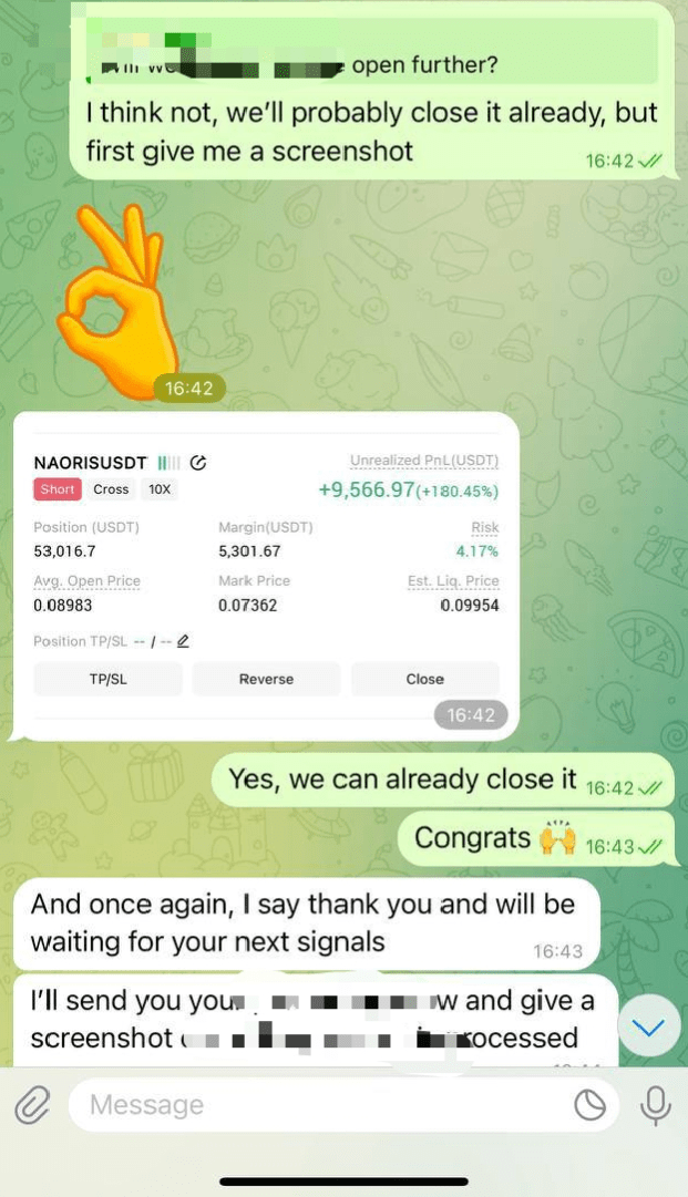 Ruch przebiegł pięknie. Kiedy cena zaczęła spadać, świeczki zaczęły się zmieniać na czerwone jedna po drugiej — jasne potwierdzenie, że analiza była trafna. Cena markowa spadła do 0,07362, przekształcając ten setup w niesamowity zysk +180,45%, wynoszący +9 566,97 USDT zysków niezrealizowanych przy marginesie 5 301 USDT.