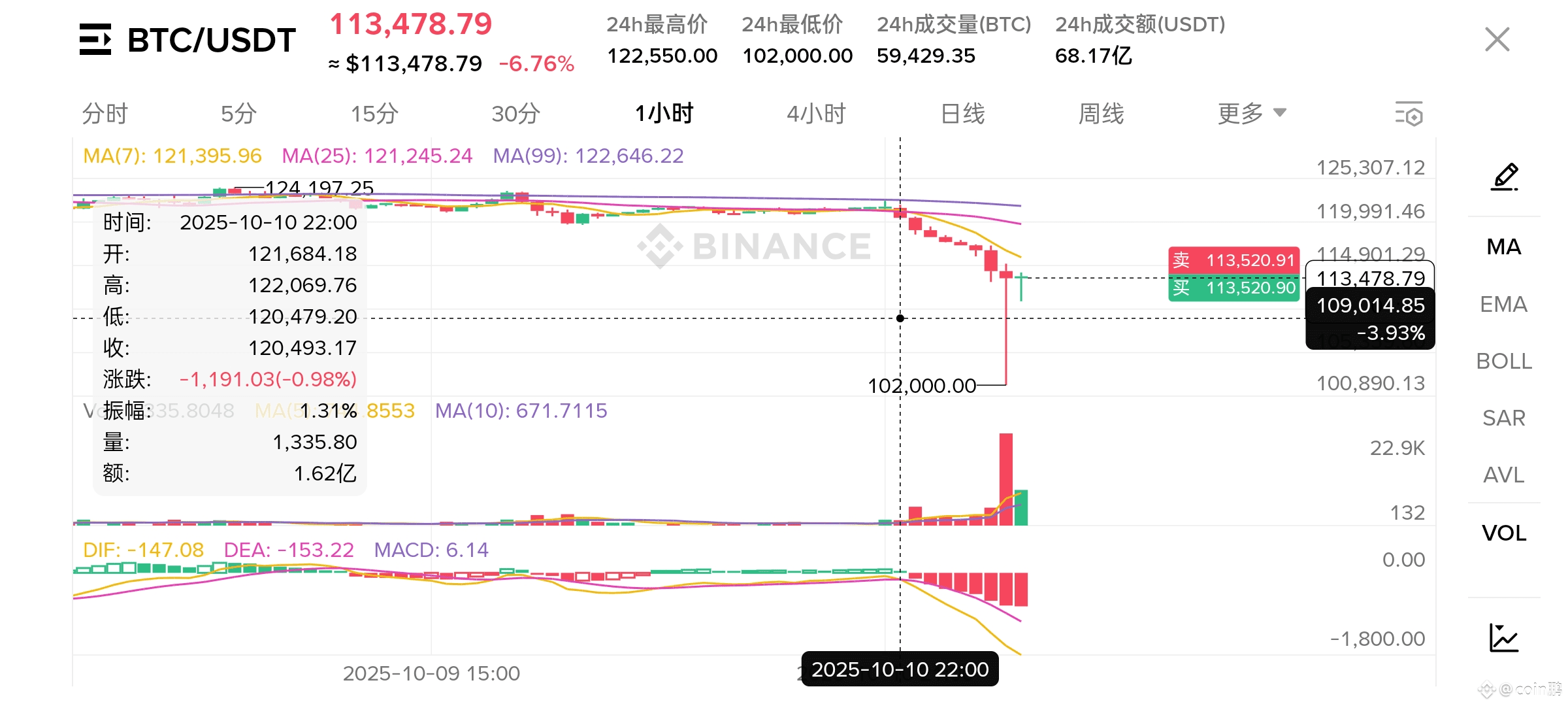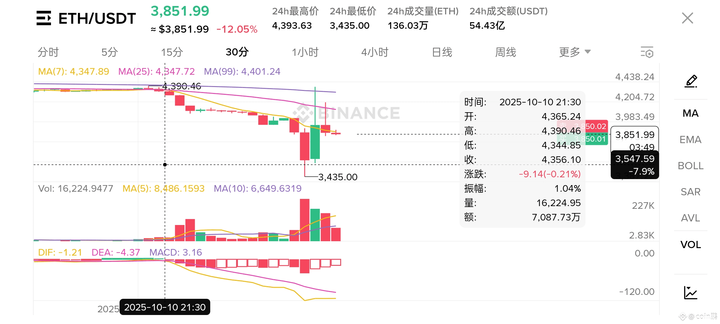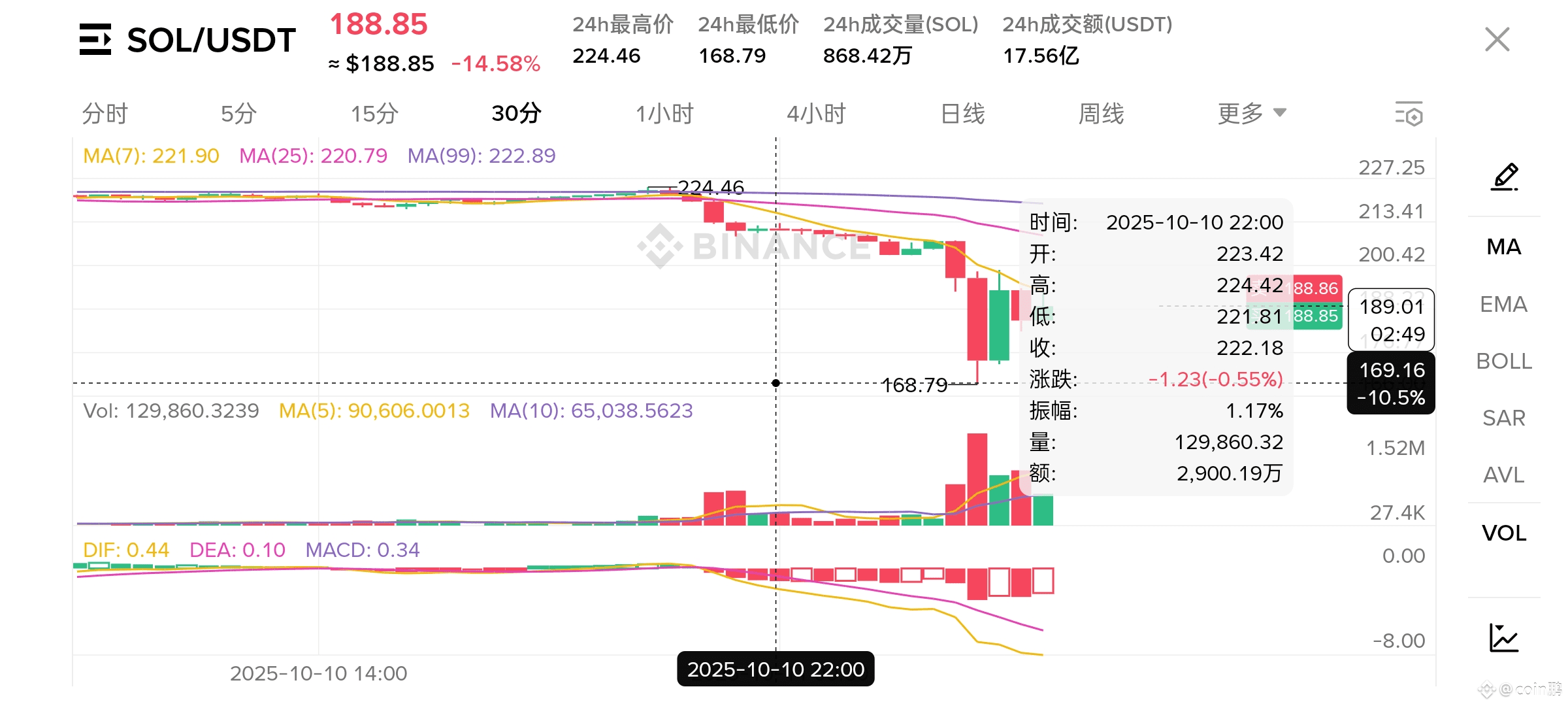 其实从昨天22:00的时候BTC就已经进入了破位下跌,只不过真正引爆的是在11日凌晨5:00开始破位重挫,这波走势ETH、SOL一直跟随着BTC走势,它们的K线几乎相同,而BNB则是在凌晨四点跟随市场情绪重挫的!