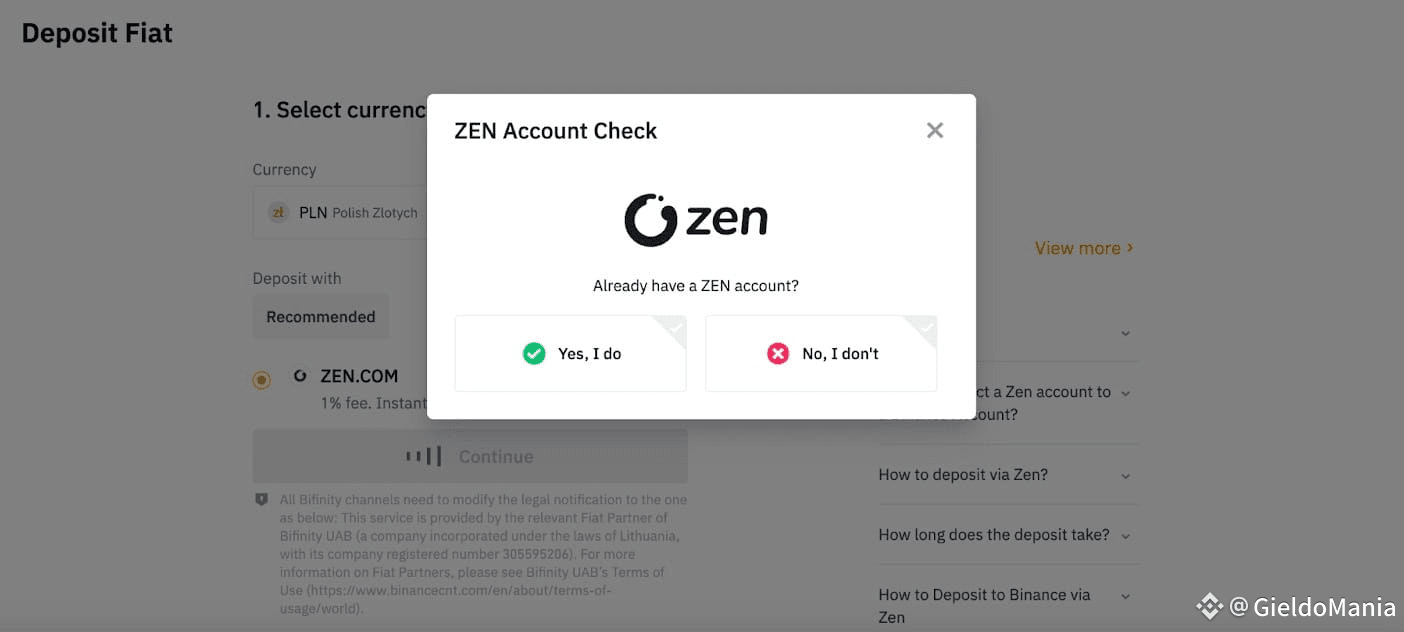 O tym, czy możesz z niego skorzystać, decyduje system Binance. Jeśli tak, uruchomi opcję Instant Flow - wystarczy podać numer telefonu lub e-mail, aby połączyć się z ZEN. Pamiętaj, że w tym trybie limit to 1000 Euro na dobę - jeśli potrzebujesz więcej, zweryfikuj tożsamość w ZEN.