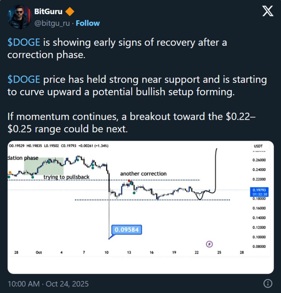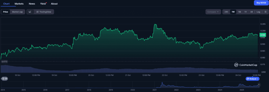 Dogecoin jako jedna z najpopularniejszych kryptowalut w formie emotikonów wzrosła w ciągu ostatniego tygodnia z 0,18 USD do 0,20 USD💥. BitGuru na X sugeruje, że DOGE formuje trend wzrostowy, co jest potencjalnym sygnałem wzrostu📊. Jeśli momentum się utrzyma, przewiduje, że cena może osiągnąć 0,25 USD.