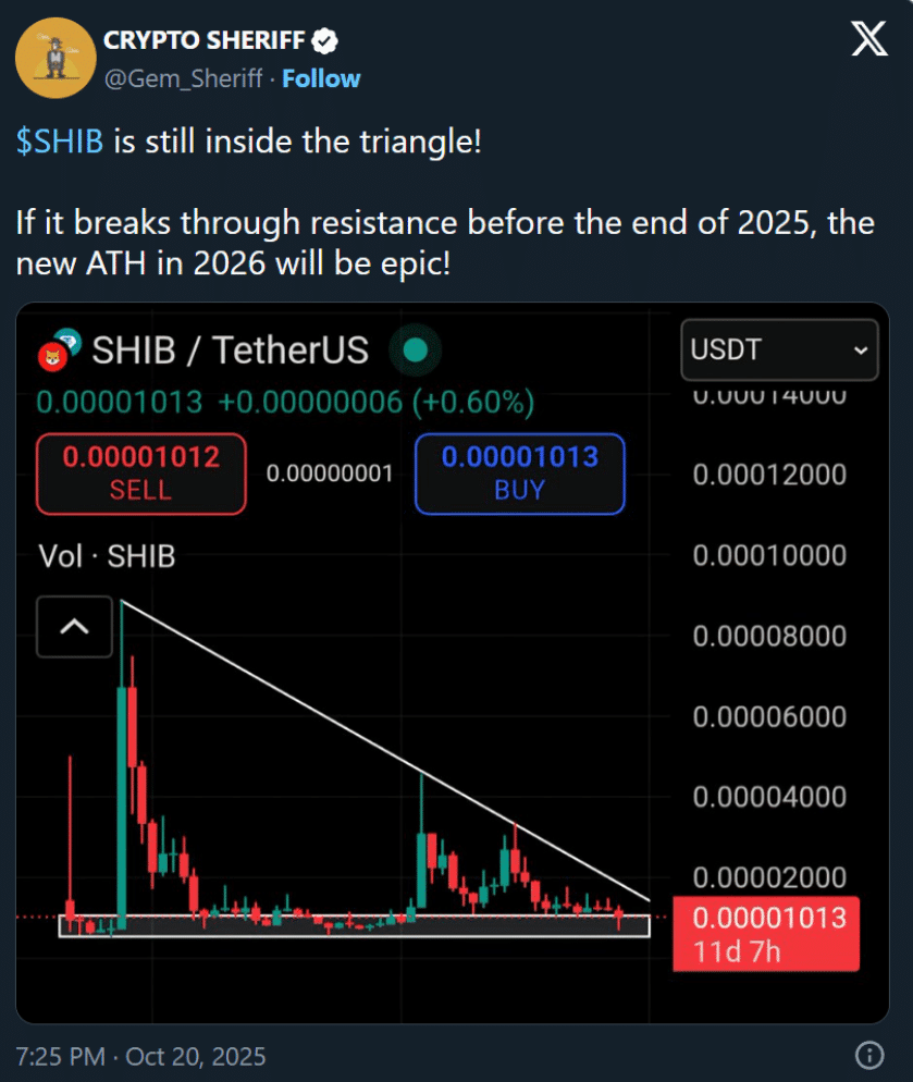 Shiba Inu również ostatnio przyciąga uwagę, w ciągu tygodnia wzrosła z 0.0000095 dolarów do 0.00001010 dolarów ✨. Crypto Sheriff zauważył, że SHIB nadal znajduje się w zakresie formacji trójkąta, a jeśli przełamie opór, może ustanowić nowe maksimum w 2026 roku.