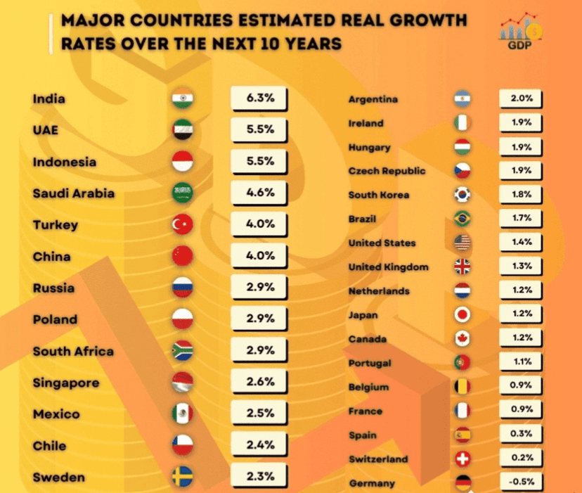 🇮🇳 Indie stoją na czołowej pozycji z przewidywaną roczną realną stopą wzrostu na poziomie 6,3% — najwyższą wśród głównych narodów. Z młodą populacją, rozwijającą się bazą przemysłową i rekordowymi inwestycjami w infrastrukturę, wzrost Indii kształtuje je na silnik wzrostu następnej dekady.