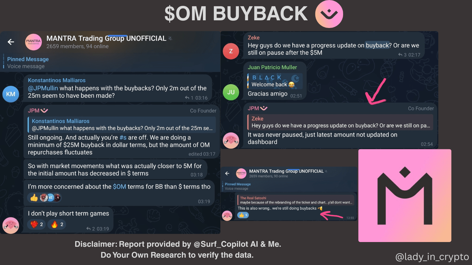 Ponadto, jeśli na chwilę przestaniesz przewijać CT i odwiedzisz nieoficjalny kanał TG MANTRA Chain, dowiesz się, że JP Mullin kilkakrotnie informował społeczność o$OM Postępy w skupowaniu.