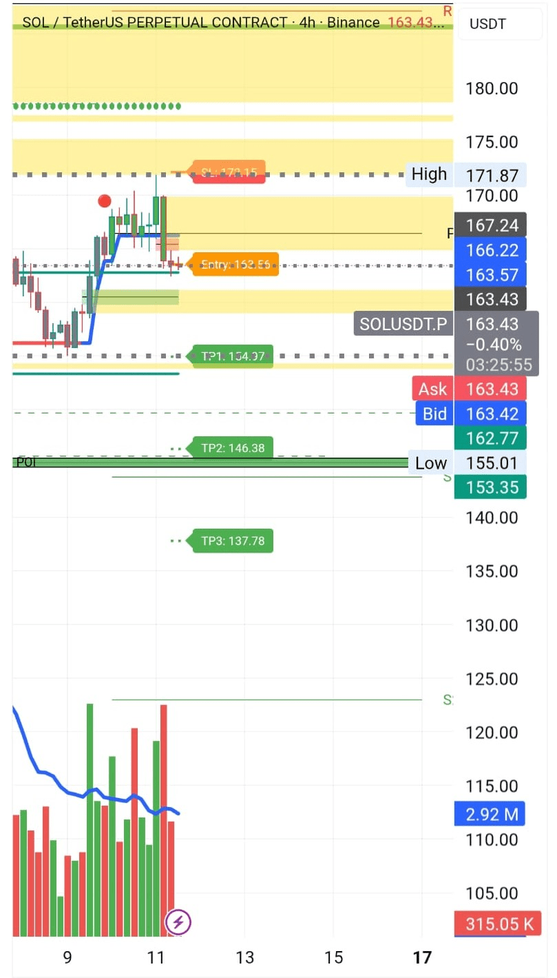 Kontrakt terminowy SOL/TetherUS na Binance pokazuje trend spadkowy, handlując po 163.43 USDT (-0.40%).