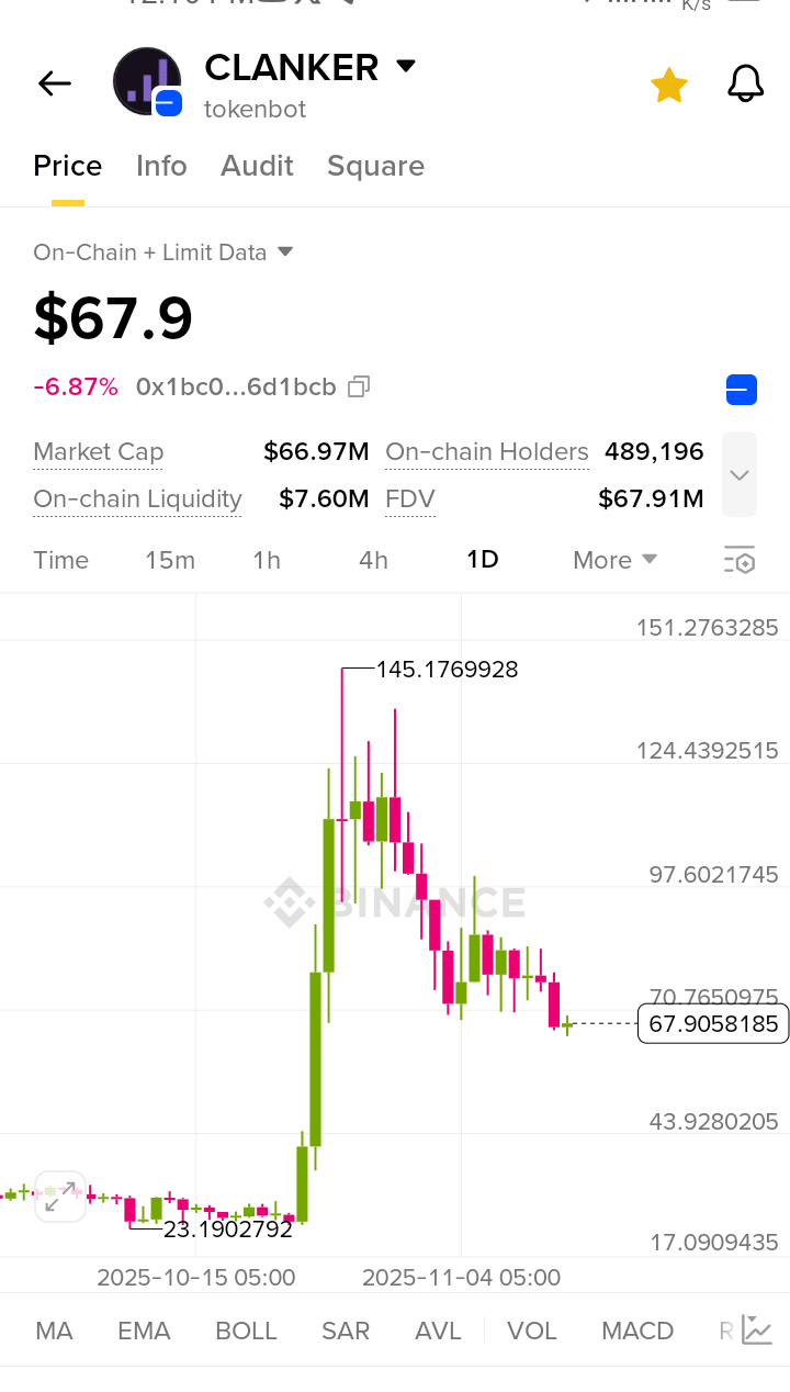 Na podstawie najnowszego przeglądu rynku, CLANKER handluje wokół 67,91 dolarów, co oznacza spadek o 6,85% w ciągu ostatnich 24 godzin. Ta korekta cenowa prawdopodobnie odzwierciedla rutynowe realizowanie zysków po wcześniejszych wzrostach, a nie fundamentalne osłabienie. Zakres handlu w ciągu 24 godzin, między 65,11 a 73,10 dolarów, podkreśla znaczną zmienność intraday, co jest powszechną cechą wschodzących aktywów cyfrowych. Dane cenowe potwierdzone przez Audit Square, platformę specjalizującą się w analizach na łańcuchu i książce zamówień, dodają wiarygodności tym liczbom. To skupienie na przejrzystości danych podkreśla zaangażowanie CLANKER-a w dokładność i integralność rynku, co często brakuje w projektach kryptograficznych na wczesnym etapie.