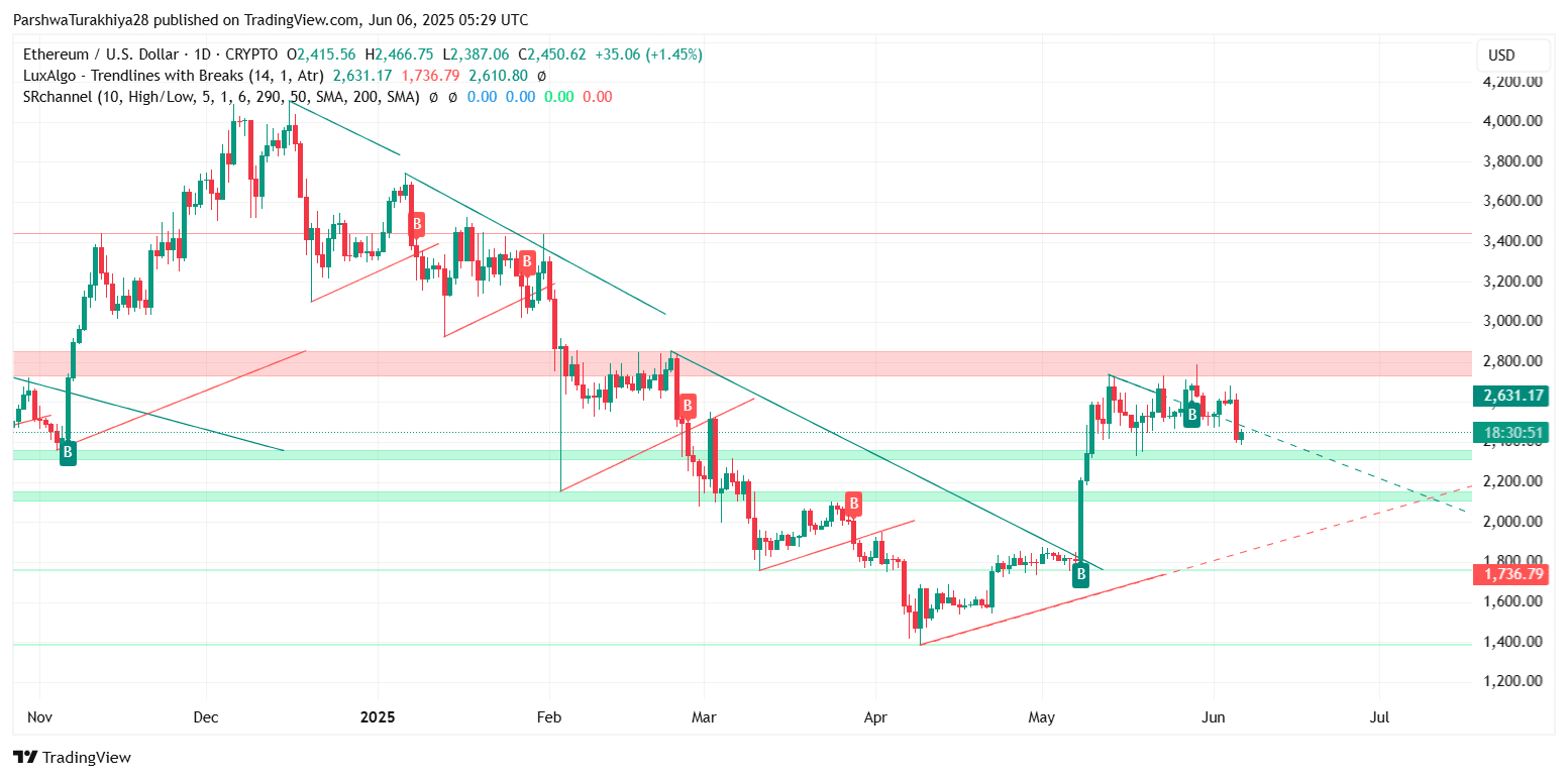$ETH handluje wewnątrz zstępującego kanału (wyższe górne granice wielokrotnie odrzucane), co sugeruje konsolidację i/lub fazę korekty, a nie świeży wybicie. CryptoPotato+1