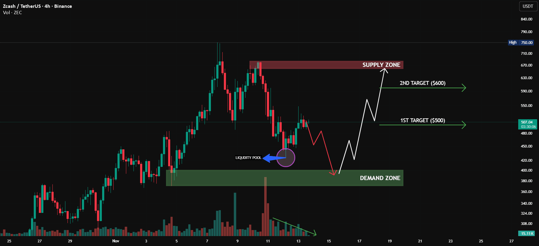 Jeśli ZEC przetrze płynność i utrzyma się powyżej strefy popytu $400–$440, kolejne cele wzrostowe to: