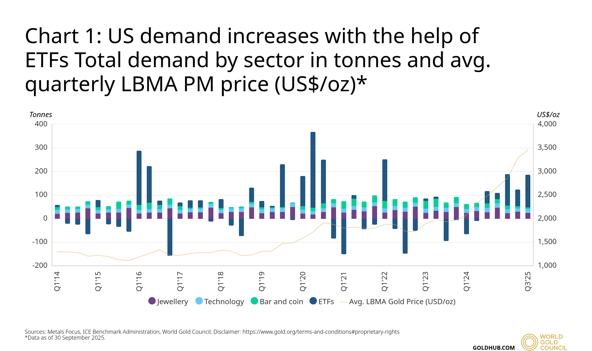 Popyt na złoto w USA wzrósł gwałtownie w III kwartale 2025 roku, rosnąc o 58% r/r do 186 ton. Wzrost ten był napędzany niemal całkowicie przez inwestycje w ETF, podczas gdy popyt konsumencki pozostał słaby.