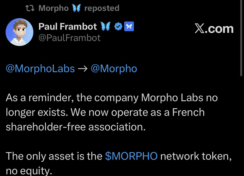 W ramach ważnego strategicznego kroku, Morpho – wiodąca platforma pożyczek zdecentralizowanych na Ethereum i Base – oficjalnie „skróciła” markę z @MorphoLabs do @Morpho. Ogłoszenie zostało opublikowane przez Paula Frambota, współzałożyciela i dyrektora generalnego, podkreślając, że Morpho Labs nie istnieje już jako tradycyjna firma. Zamiast tego, Morpho działa teraz jako stowarzyszenie bez akcjonariuszy (shareholder-free association) zgodnie z prawem francuskim, z jedynym aktywem będącym tokenem sieci $MORPHO. Brak udziałów, brak indywidualnych praw własności – wszystko jest ukierunkowane na konsensus społeczności.