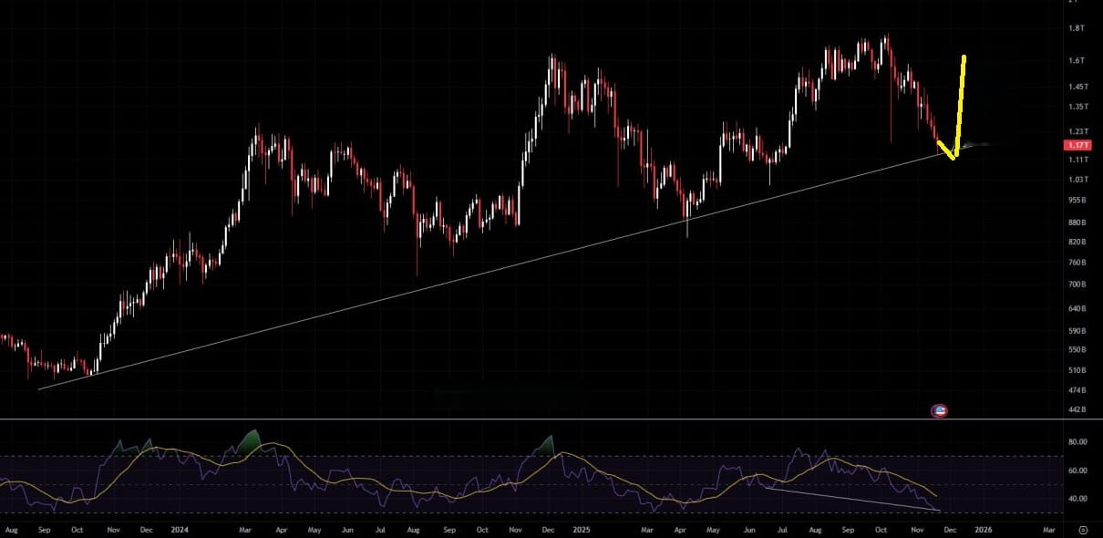 Kapitalizacja rynku altcoinów operuje powyżej historycznej linii trendu wsparcia. RSI (Wskaźnik Siły Relatywnej) znajduje się w strefie skrajnego wyprzedania i pokazuje ukrytą byczą dywergencję.
