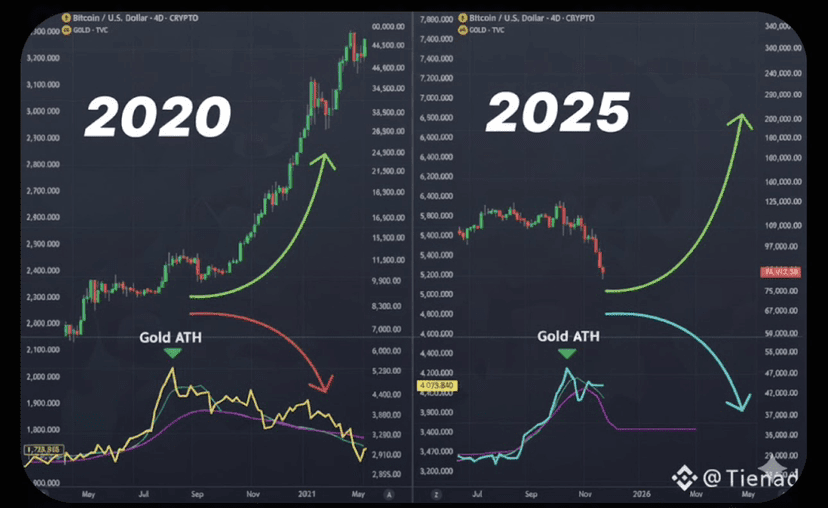 Ruch złota śledzi jego zachowanie przed rajdem w 2020 roku — to poważna wskazówka, że następuje szeroka zmiana na rynku.