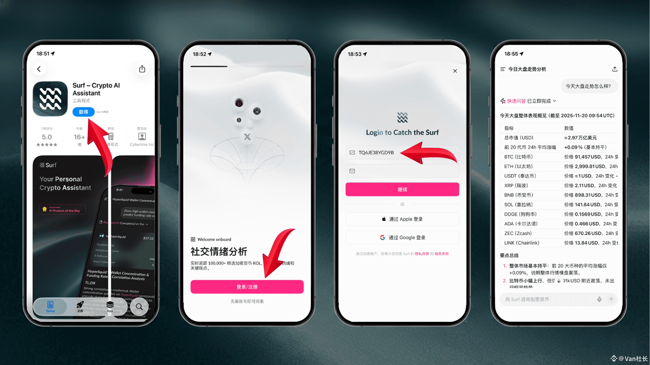 为了管住这双乱开单的手,最近我强制自己把看盘习惯改了。每次想开单前,先打开 Surf AI 的手机版输一下代币名。