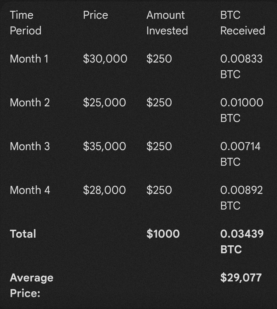 Dzięki DCA zainwestowałeś w różnice cenowe po średnim koszcie wynoszącym 29 077 dolarów.