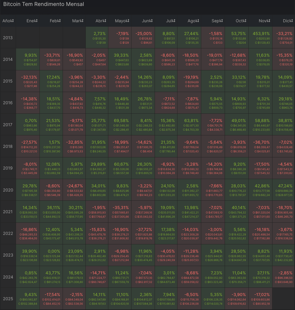 Historycznie październik zazwyczaj jest miesiącem wzrostowym dla BTC, stąd mem "Uptober". W tym roku było wręcz przeciwnie: miesiąc zakończył się spadkiem o około 4%, łamiąc serię sześciu kolejnych październików na zielono.