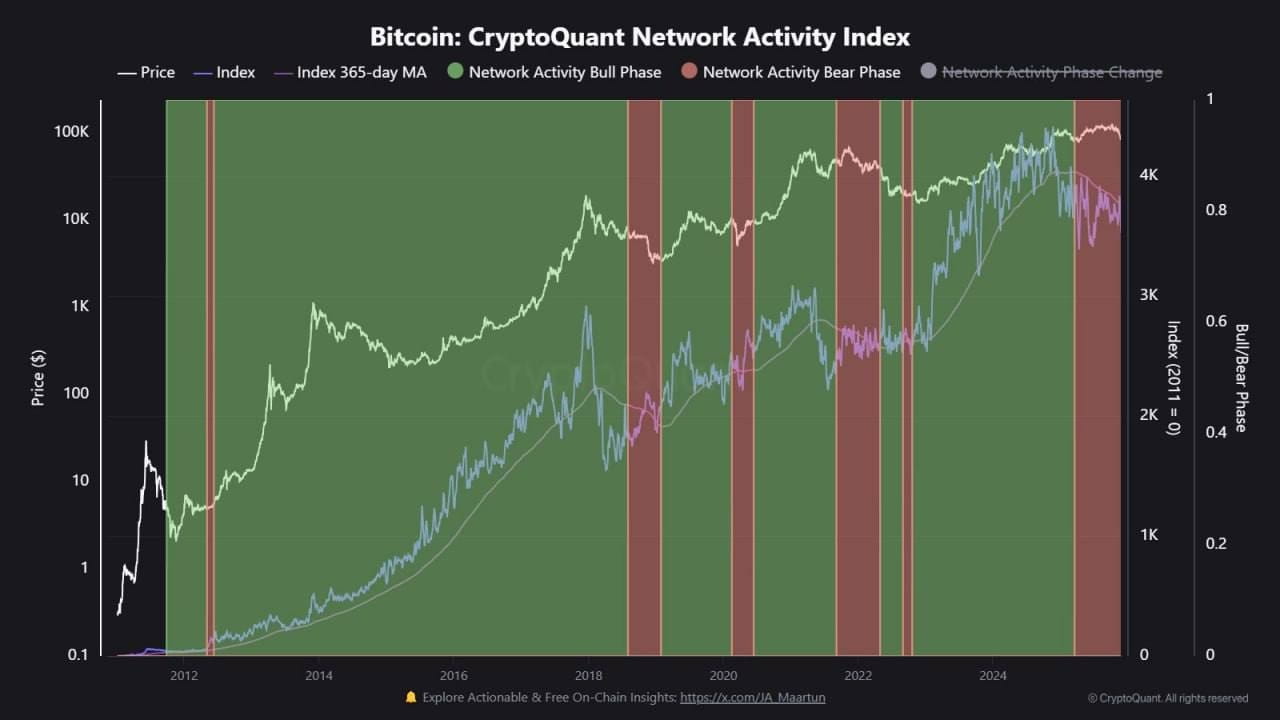 Glassnode zauważa, że kluczowe wskaźniki sieci — liczba aktywnych adresów i transakcji — nadal maleją. Dla nowicjuszy: oznacza to zmniejszenie aktywności użytkowników i traderów w sieci. Kiedy takich działań jest mniej, rynek zwykle przechodzi w bardziej spokojną fazę z obniżoną zmiennością.