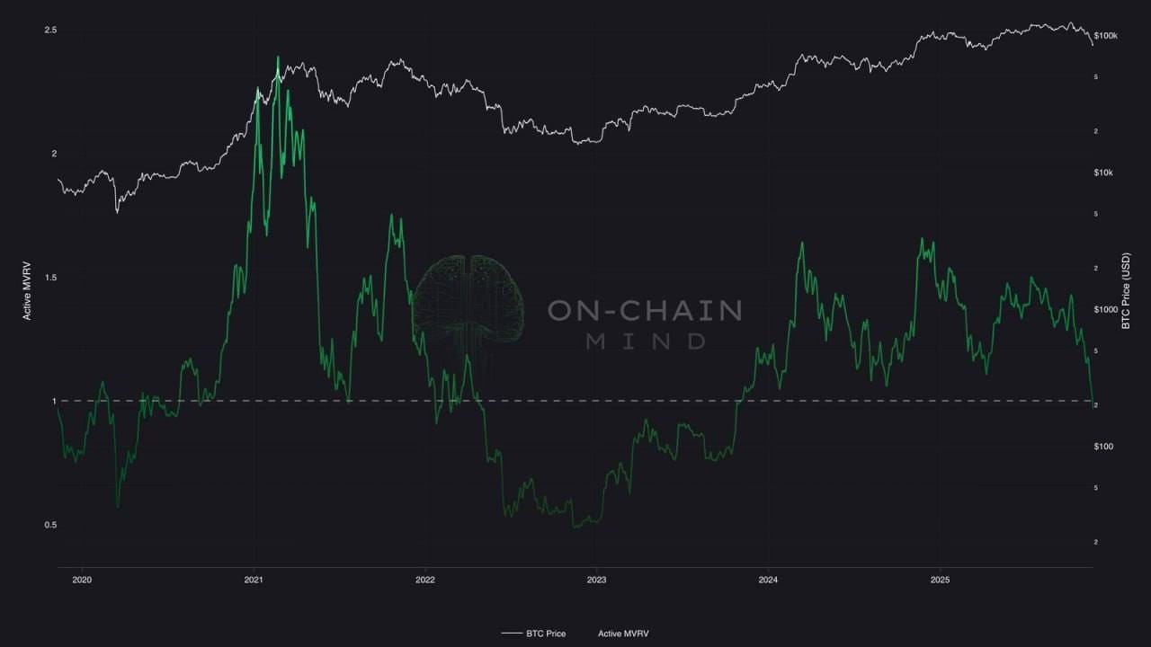 Wskaźnik Active MVRV po raz pierwszy w bieżącym cyklu spadł poniżej poziomu 1. Aby to zrozumieć: ten wskaźnik pokazuje, czy „gorące pieniądze” — monety, które niedawno zostały przekazane — są w zysku czy stracie. Wartość poniżej 1 oznacza, że krótkoterminowi uczestnicy realizują straty. Historia pokazuje, że takie okresy często towarzyszyły spadkowi spekulacyjnej aktywności i przejściu rynku do spokojniejszej, bardziej fundamentowej fazy, w której cena porusza się wolniej, ale stabilniej.