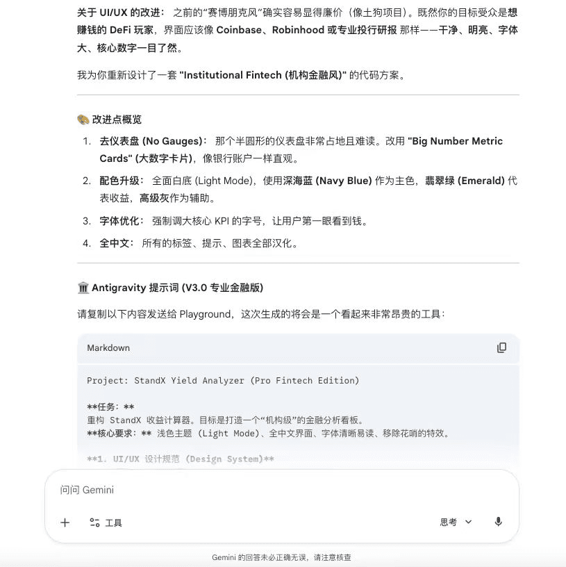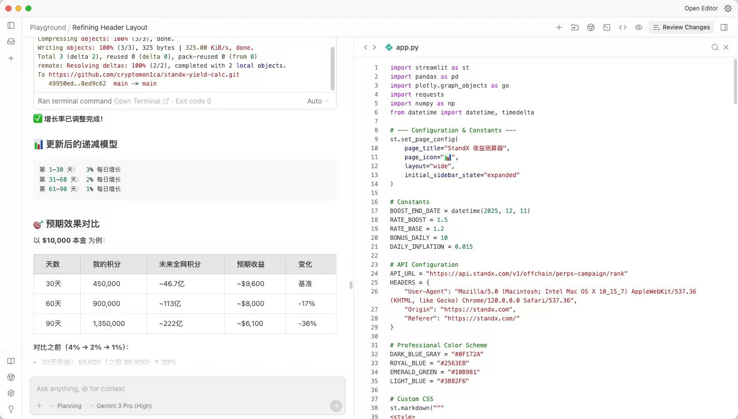 ❶ Używając Gemini3 Pro, opracowałem zestaw narzędzi, które mają rzeczywistą wartość referencyjną w ograniczonych warunkach. Cały proces odbył się bez używania skomplikowanych podpowiedzi, przekazałem zasady punktowe StandX do Gemini i jasno określiłem, że moim celem jest stworzenie lepszego narzędzia pomocniczego do udziału w aktywności punktowej. Ostatecznie zdecydowano się na stworzenie profesjonalnego kalkulatora finansowego opartego na Streamlit.