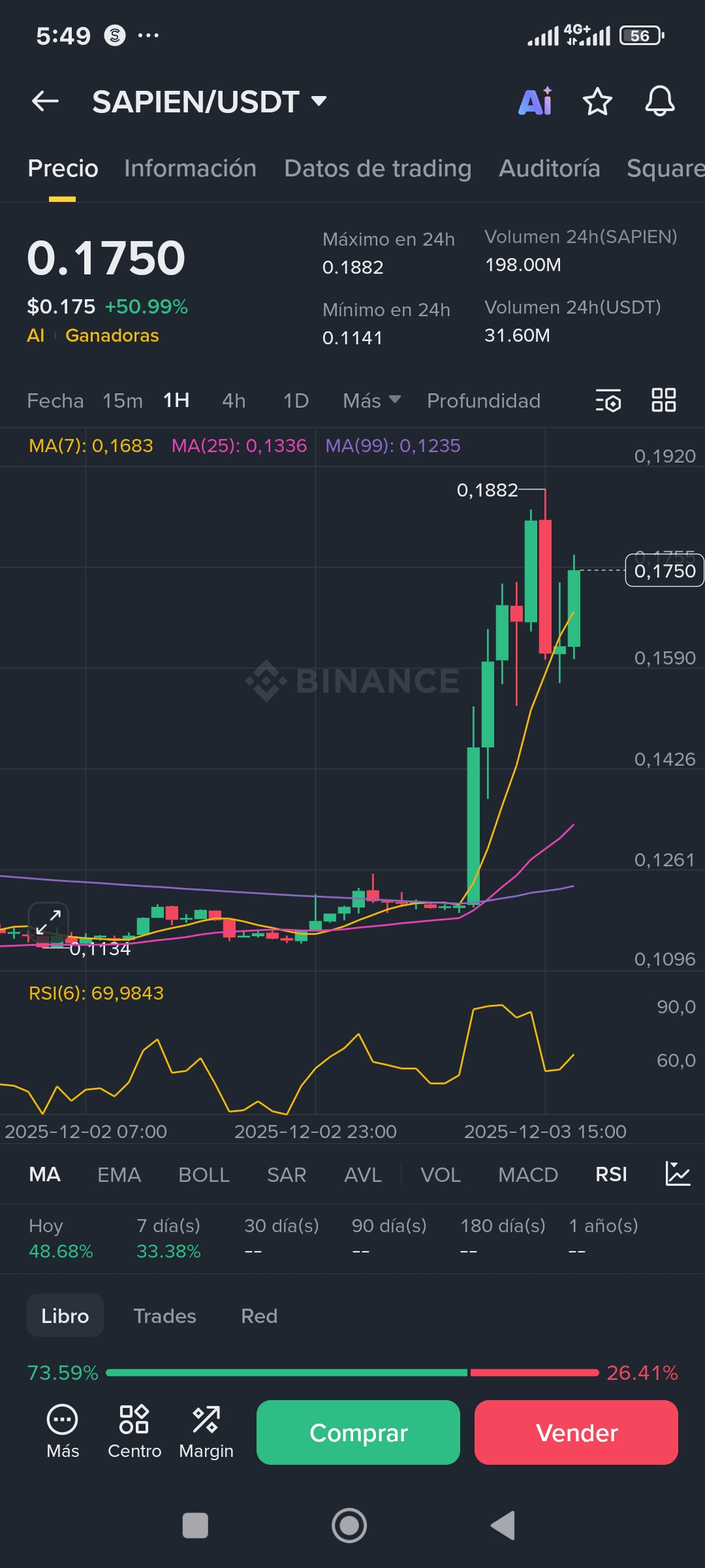Para $SAPIEN /USDT doświadcza silnego i potwierdzonego trendu wzrostowego, z zyskiem powyżej +50% w ciągu 24 godzin i notowaniem na poziomie $0.1750.