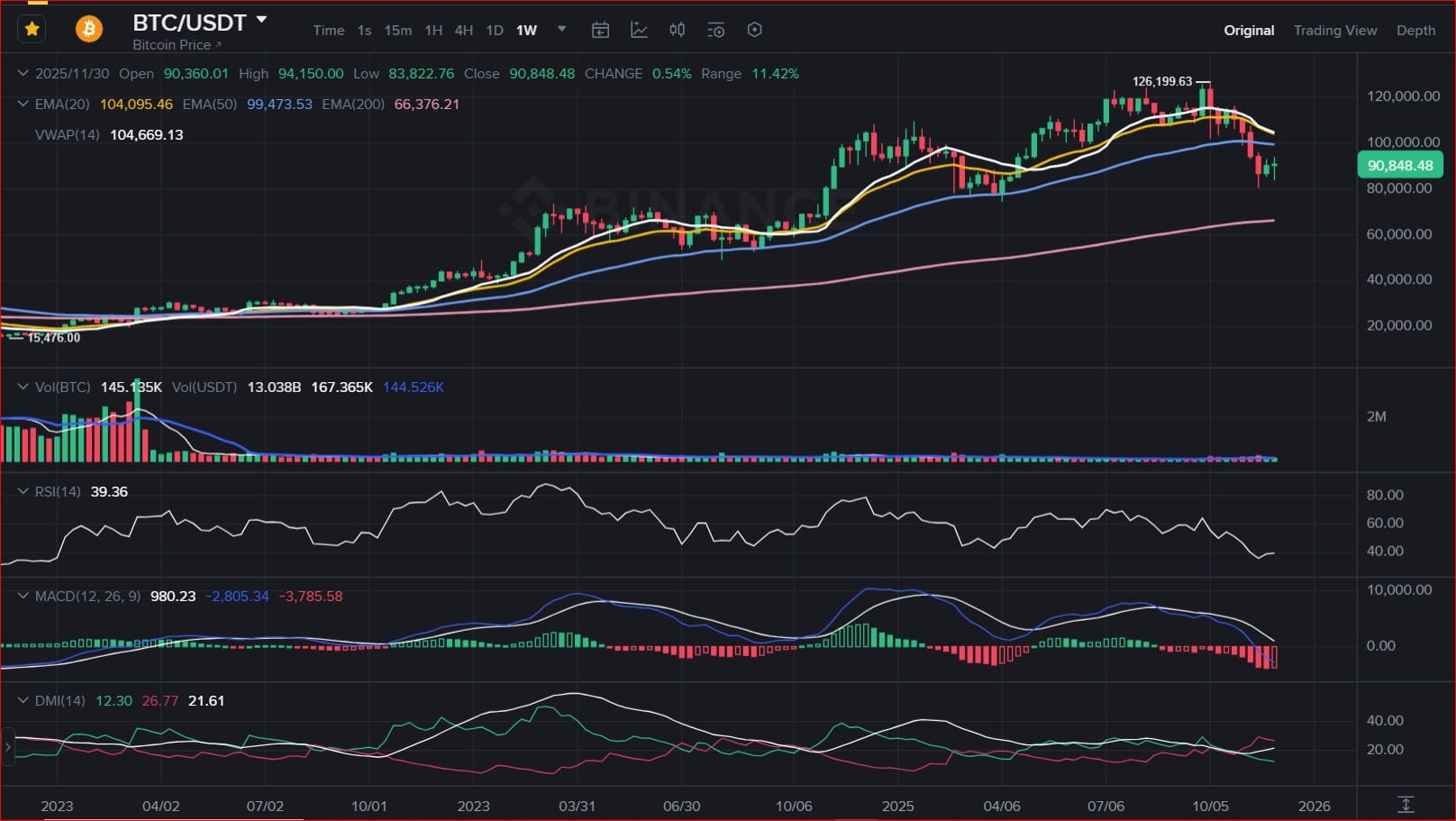 👇 Patrząc na ten wykres tygodniowy... Czy jesteś optymistą co do odzyskania $100k w grudniu, czy idziemy w kierunku $80k?