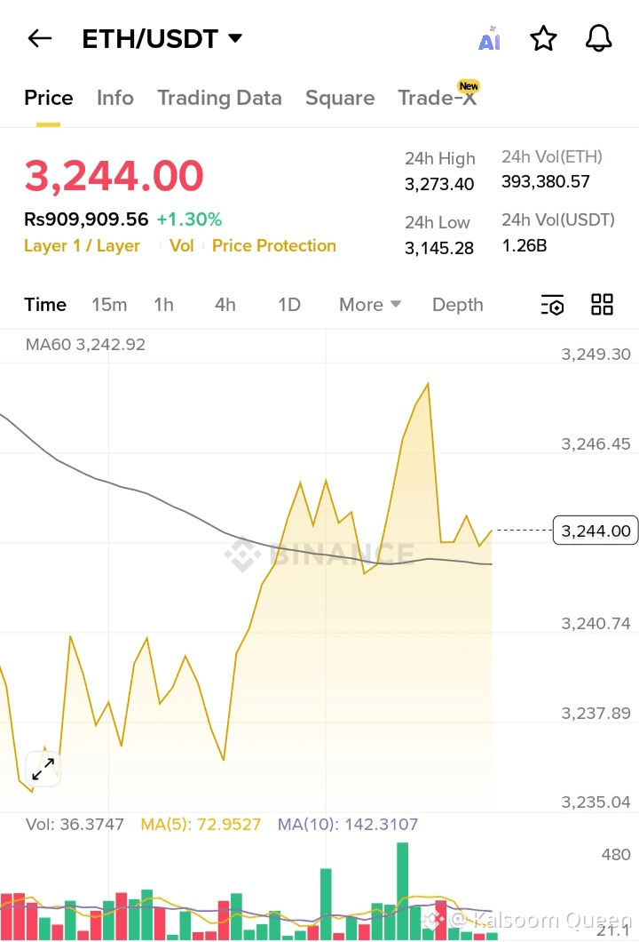 The ETH/USDT chart indicates a short-term bullish recovery, with price currently trading around $3,244, reflecting a +1.30% upside within 24 hours. The chart shows ETH pushing back above the MA60 (3,242.92) level, suggesting a potential shift in momentum as buyers regain confidence after testing the 24h low of $3,145. Increasing volume near the local peak signals renewed interest, and if $ETH sustains support above the MA60, the next resistance zone appears in the $3,270–$3,300 range. A breakout from this level could trigger a stronger continuation rally for Ethereum ($ETH ).