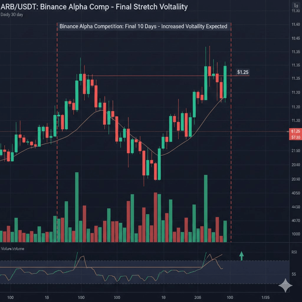 To jest wykres świecowy Dzienny (1D) dla wiecznego kontraktu ARB/USDT, skupiający się na fazie wysokiej zmienności odpowiadającej ostatnim 10 dniom Finału Konkursu Handlowego Binance Alpha.