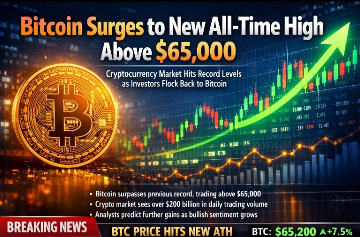 #bitcoin wzrosła do nowego najwyższego poziomu, notując powyżej 65 000 USD, ponieważ silne zapotrzebowanie inwestorów wraca na rynek.