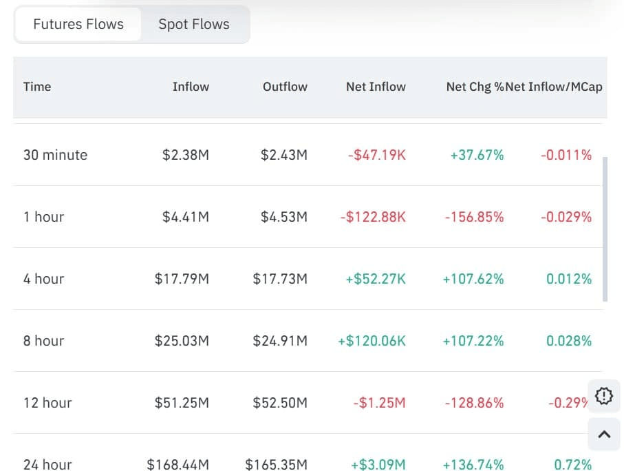 Netto przepływ futures wzrósł o 136,74% do 3,09 miliona USD, potwierdzając dominację kupujących