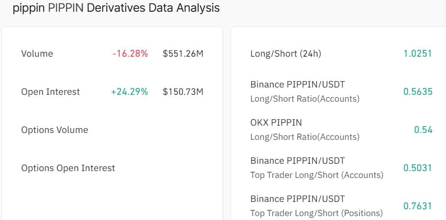 Dodatkowo, stosunek długów do krótkich PIPPIN wzrósł do 1,025, wskazując na tendencję do pozycji długich. Choć średni stosunek wynosił około 0,5 na głównych giełdach, takich jak Binance i OKX, wzrost wskazuje na rosnące zaufanie do kierunku wśród traderów z dźwignią.