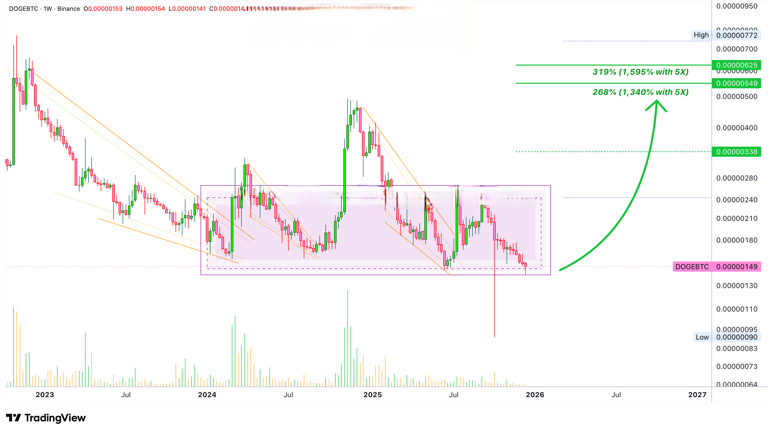 Widząc DOGEBTC w okresie bessy od listopada 2024 roku, możesz celować tak wysoko, jak chcesz. Zachowuję ostrożność z celami tutaj, ponieważ używamy dźwigni w tej transakcji. Jeśli handlujesz na rynku spot, możesz łatwo celować wyżej. Poziomy pokazane na wykresie, 1,340% & 1,595%, powinny być uznawane za łatwe cele. Oczekujemy, że te cele zostaną osiągnięte w średnim okresie.