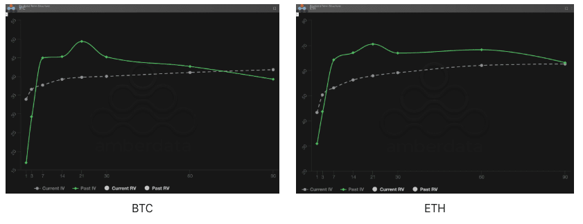Zmiany formacji: w porównaniu do ogromnego „garbu” (zwykle wyceniającego konkretne ryzyko, takie jak posiedzenia) utworzonego przez Past IV w ciągu 14-21 dni, krzywa Current IV w tym tygodniu wróciła do płaskiej formy, nie pokazując typowego Contango (blisko niskie, daleko wysokie) idealnej formy. Current IV w krótkim okresie wprawdzie spadł, ale w średnim i długim okresie (30 dni+) utrzymuje poziom porównywalny, a nawet nieco wyższy, cała krzywa wykazuje spłaszczenie.