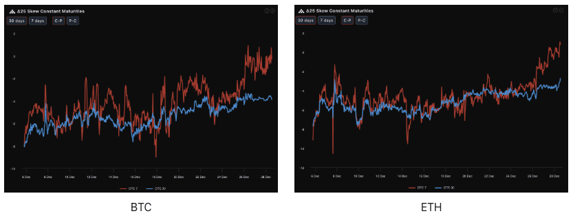 W ostatnim czasie (DTE 7): czerwona linia znacząco wzrosła, 7-dniowy Skew BTC zbliża się do osi 0, a ETH nawet chwilowo przekroczył oś 0 w pozytywne wartości. To wskazuje na znaczny spadek krótkoterminowego popytu na ochronę przed spadkiem w tygodniu między świętami, a traderzy uważają, że w tym tygodniu rynek będzie utrzymywał się w konsolidacji lub lekko odbijał, co wskazuje na ożywienie krótkoterminowego optymizmu.