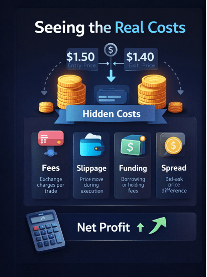 Narzędzia takie jak skrypty TradingView, kalkulatory PnL giełdy lub analizatory arkuszy kalkulacyjnych obliczają rzeczywisty koszt dla ciebie.