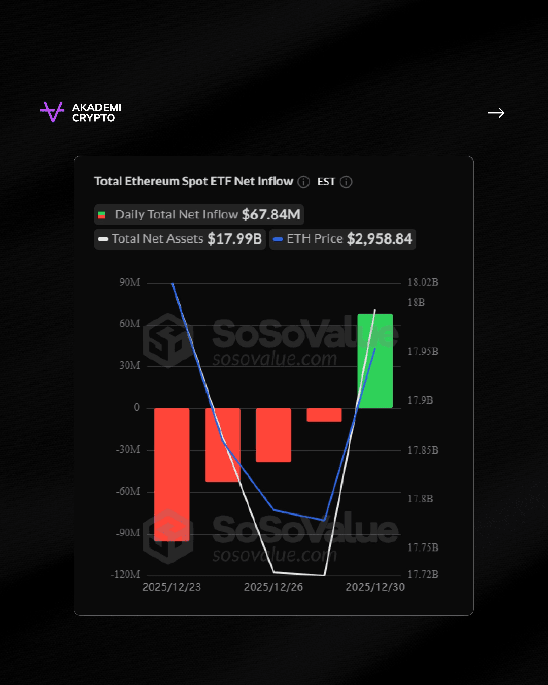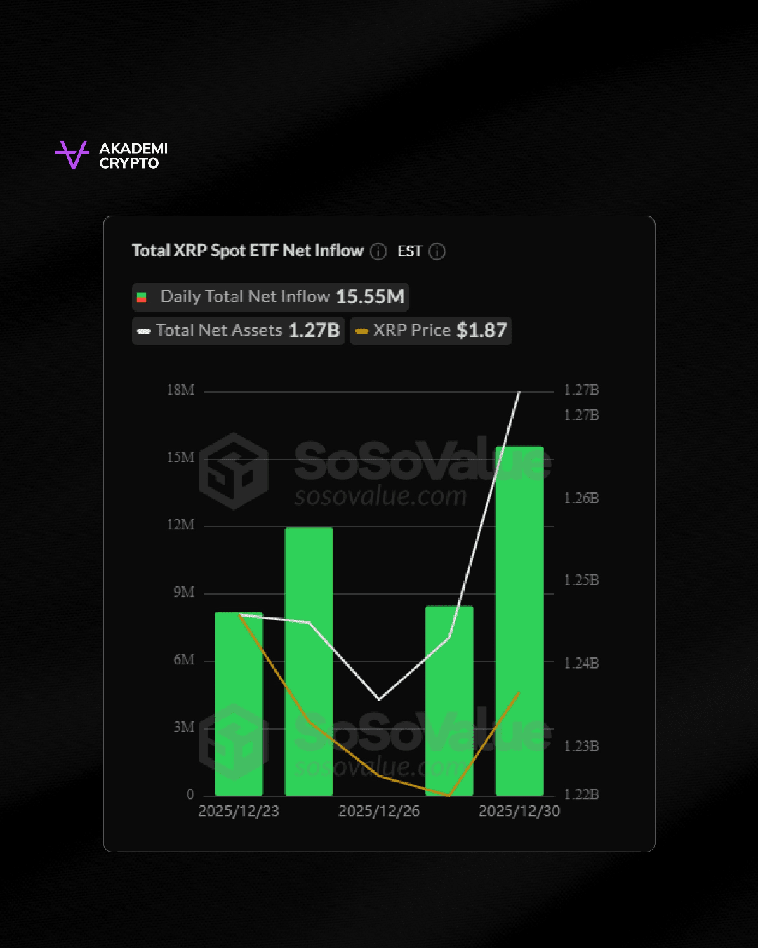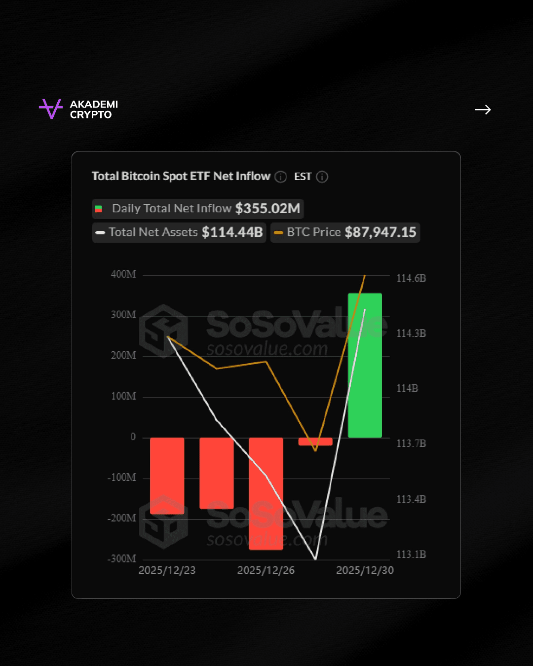 Co więcej, ETF Bitcoin otrzymał netto fundusze w wysokości 355 milionów USD, co stanowi około 5,9 biliona Rp, następnie Ethereum o wartości 67,8 miliona USD, czyli 1,1 biliona Rp, a XRP osiągnęło 15,5 miliona USD, co odpowiada 259,3 miliardom Rp, co miało miejsce we wtorek (30/12).