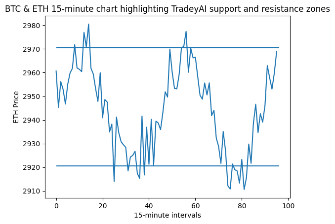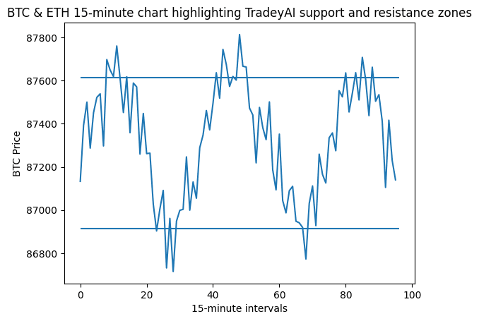 Struktura intraday BTC i ETH w czasie 15 minut. TradeyAI ciągle śledzi strefy wsparcia i oporu, pomagając traderom reagować szybciej, gdy cena zbliża się do kluczowych poziomów.