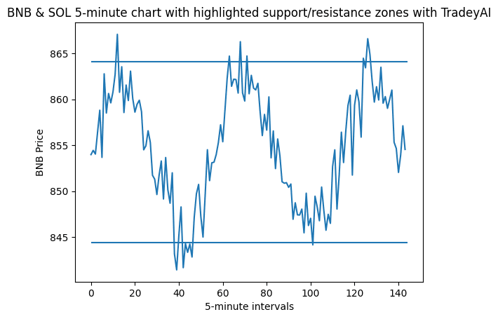Wykres 5-minutowy BNB & SOL pokazujący strefy wsparcia i oporu zidentyfikowane przez TradeyAI, pomagające traderom intraday przewidywać reakcje zamiast gonić za ceną.