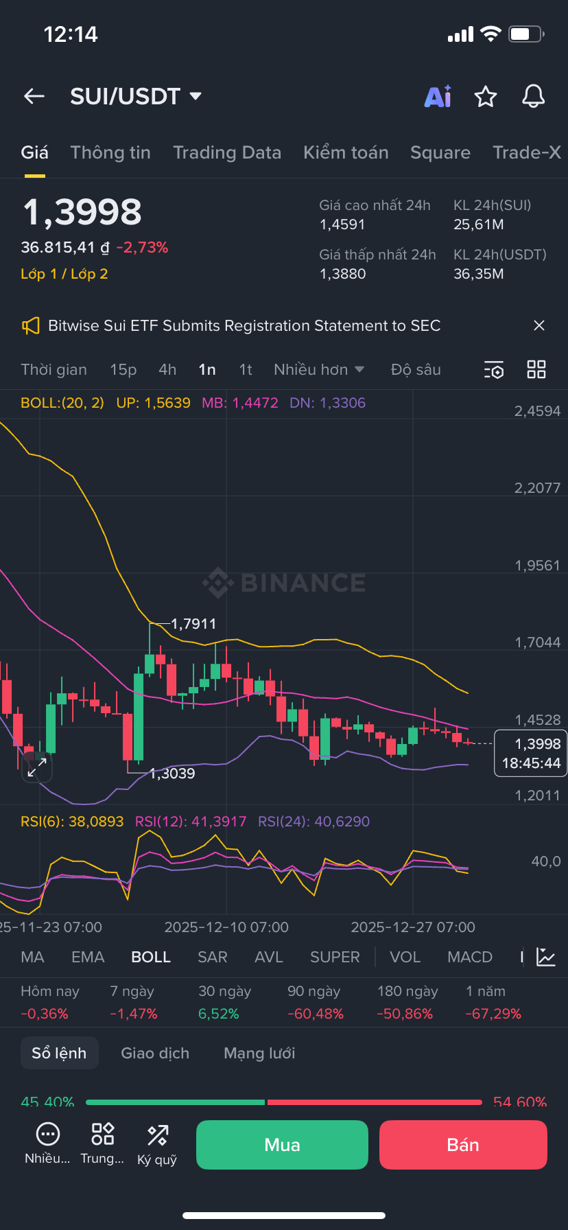 SUI oscyluje wokół ~1,4 USD z niewielkimi wahaniami ostatnio, co odbija się na ostrożnym nastawieniu rynku.