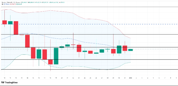 Bitcoin jest notowany po 87 937 dolarów, ograniczony w okolicy oporu 88 210 dolarów od prawie tygodnia. Pomimo powtarzających się odrzuceń, główna kryptowaluta weszła w fazę konsolidacji, sygnalizując niepewność rynku raczej niż agresywną presję sprzedaży.