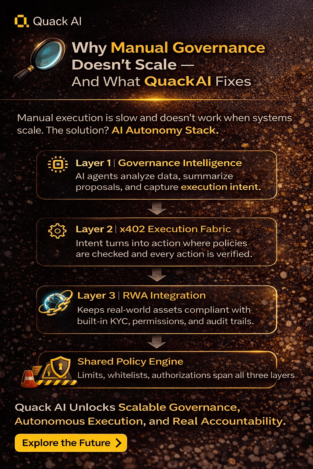 Quack AI rozwiązuje ten problem wprowadzając stos autonomii AI, w którym inteligencja, wykonanie i zgodność poruszają się razem.