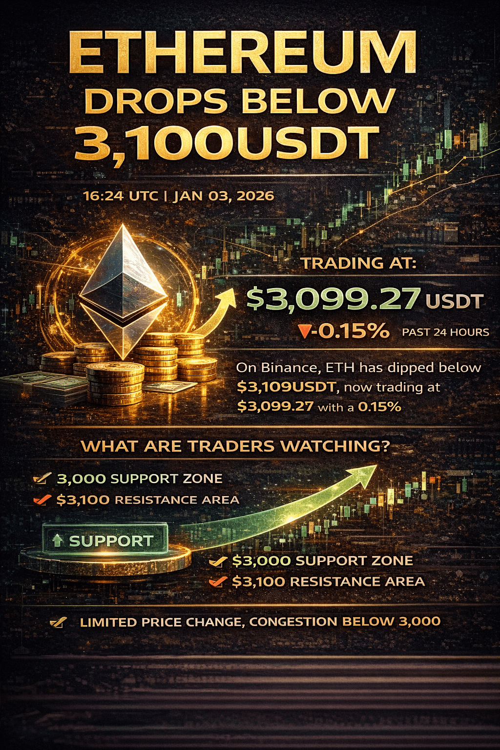 Ethereum na krótko spadło poniżej 3 100 USDT 3 stycznia 2026 roku, z umiarkowanym spadkiem o 0,15% — stosunkowo mały ruch cenowy w zakresie, który traderzy ściśle monitorują. Strefa 3 000–3 100 USD pozostaje kluczowym polem bitwy dla krótkoterminowego kierunku, gdy rynki nawigują przez szersze czynniki makroekonomiczne i techniczne.