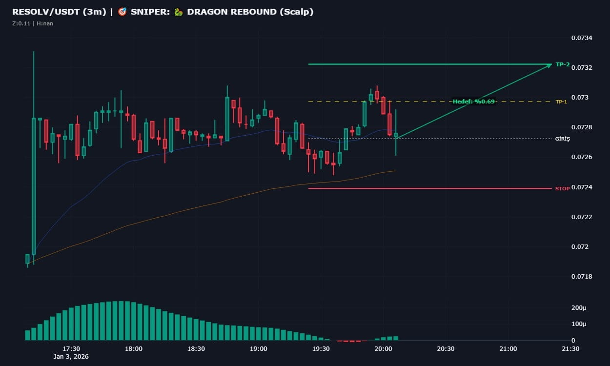 Witajcie wszyscy! Jestem Analitykiem, do waszej dyspozycji! Przygotowaliśmy się do długiej pozycji na wykresie 3-minutowym dla RESOLV/USDT. Cena wynosi 0.07272362, jest w trendzie wzrostowym, a RSI krąży w neutralnym obszarze na poziomie 49.49, co nie jest jeszcze bardzo silnym sygnałem, ale wskazuje na potencjał ruchu w górę. Dane takie jak Z-Score 0.11 i RSI-Vel -11.8 również wspierają lekkie oczekiwania na odbicie. Jesteśmy gotowi do scalpowania z naszą strategią Dragon Rebound; zobaczymy, dokąd nas przeniesie ten skok smoka!
