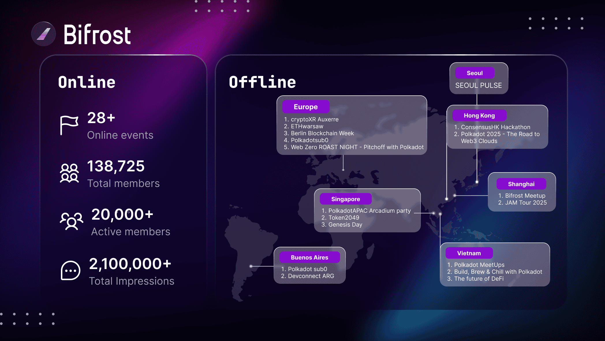 Zespół Bifrost wziął udział w 27 globalnych wydarzeniach w 10 miastach w 2025 roku, w tym Token2049 w Singapurze i Korea Blockchain Week. Te zaangażowania służyły jako pętle sprzężenia zwrotnego dla iteracji produktu i dostosowania do ekosystemu, a nie czysto działań marketingowych.