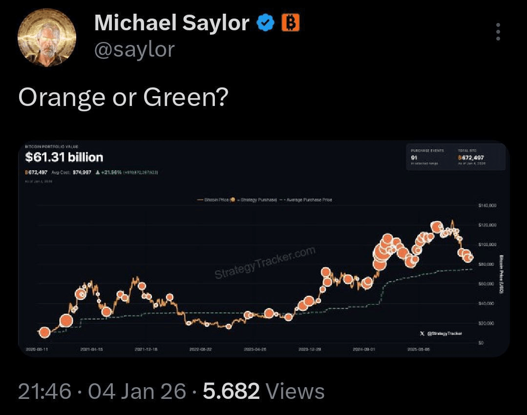 Ostatni pomarańczowy punkt Michaela Saylora ponownie pokazał jego zdolność do zmieniania zachowania rynku. Bitcoin przekroczył 91 000 dolarów kilka godzin po publikacji prezydenta Strategy, ożywiając spekulacje na temat strategii akumulacji MicroStrategy i jej wpływu na ogólne nastroje.
