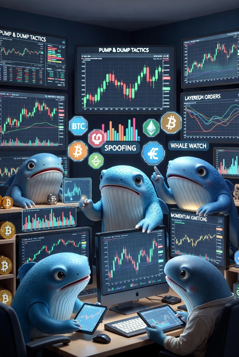 W 2025 roku, według Whale Alert i Arkham Intelligence, stare portfele (uśpione 10–14 lat) zostały aktywowane, sprzedając miliardy BTC i zwiększając presję na cenę. Jeden wieloryb we wrześniu 2025 sprzedał 1176 BTC ($136 mln), sygnalizując zmienność. Rynek kryptowalut jest mały pod względem kapitalizacji (~$3–4 bilionów w szczycie 2025), zmienny i słabo regulowany. Duża transakcja wieloryba tworzy nierównowagę: zakup podnosi cenę (FOMO), sprzedaż — załamanie (FUD). Badanie Federalnego Rezerwy Filadelfii (2025) wykazało: duzi posiadacze ETH zwiększają pozycje przed wzrostem, mali — sprzedają ze stratą. Zmienność częściej pochodzi od detalistów, ale kierunek — od wielorybów. Taktyki manipulacji: od klasyków do 2025. Wieloryby nie zawsze manipulują złośliwie — czasami po prostu realizują zysk. Ale wiele taktyk jest zamierzonych: Pump and Dump — Klasyka memecoinów. Wieloryby (lub insiderzy) kontrolują 70–90% podaży, hype'ują w social media, napędzają cenę, a potem dumpują. Przykłady 2025: $TRUMP (szczyt $72, potem załamanie z powodu braku rzeczywistego popytu), $LIBRA (związany z politykami, kapitalizacja $4,4 mld w minutach, potem upadek). NexFundAI (2024–2025) — FBI ujawniło schemat z fałszywą platformą.