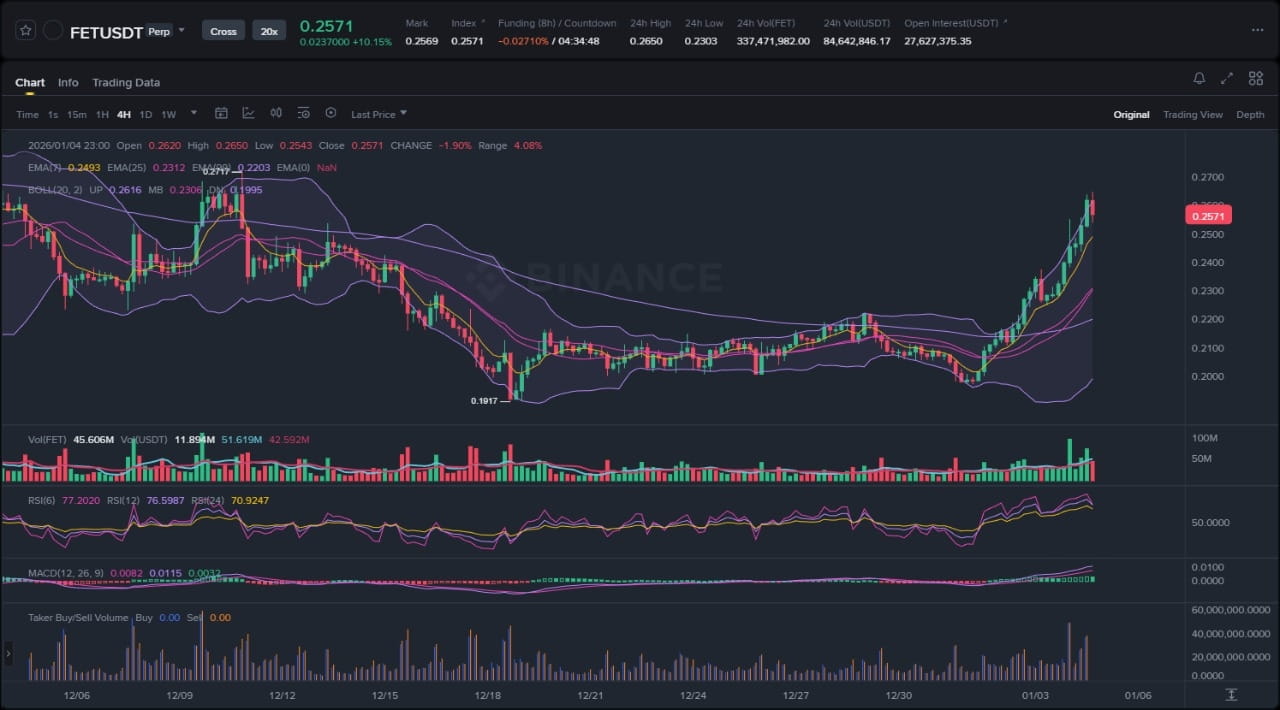 Pierwszy temat—momentum akcji cenowej (bycze): Raport Blockonomi z 4 stycznia szczegółowo opisuje 20% wzrost FET, który przełamał 6-miesięczny trend spadkowy, przy czym cena stabilizuje się w pobliżu $0.26 w obliczu zmieniającej się struktury technicznej i zachowania rynku w krótkim okresie. Artykuł Currency Analytics z 11 grudnia zauważa 11% wzrost do 10 grudnia, przyciągając uwagę inwestorów mimo ryzyk zmienności. To wzmacnia narrację wybicia wykresu, sugerując, że faza dystrybucji mogła się zakończyć.