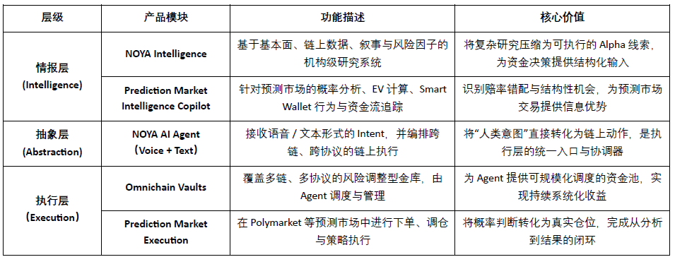 W kształcie produktu, NOYA wspiera różne formy uczestnictwa, takie jak użytkownicy generujący pasywny dochód, aktywni traderzy oraz uczestnicy rynku prognoz, a także poprzez projektowanie za pomocą Omnichain Execution, AI Agents & Intents oraz Vault Abstraction, modułowo i automatycznie zarządza wieloma łańcuchami płynności, złożoną realizacją strategii i kontrolą ryzyka.